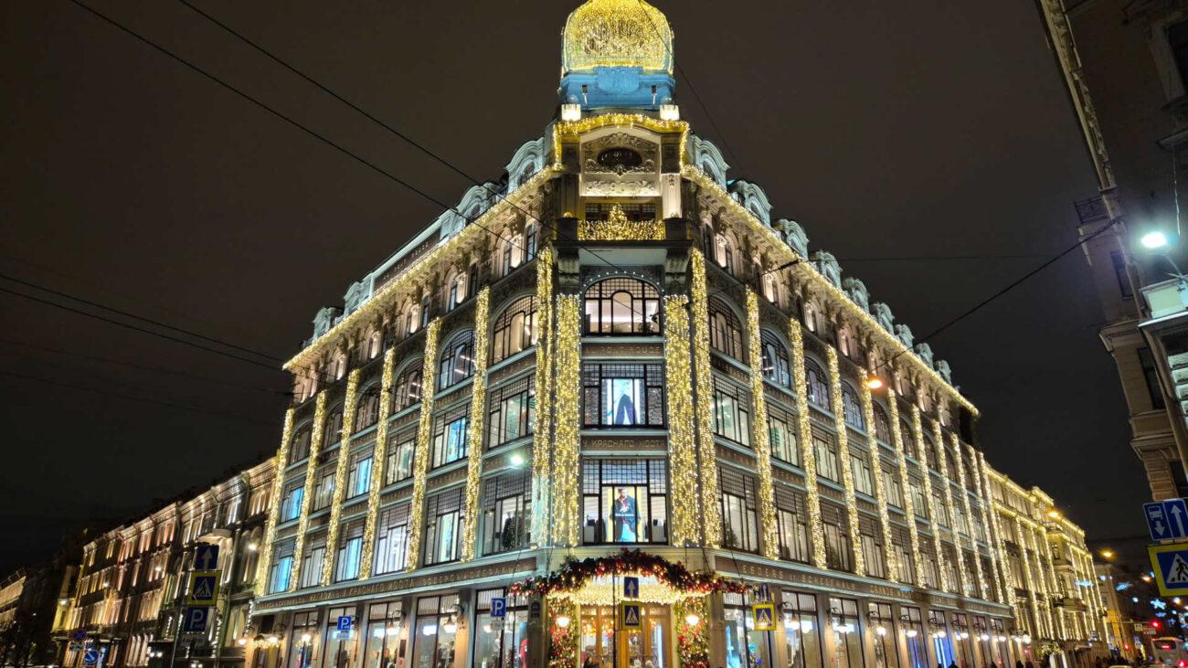 Торговый дом: фасад в огнях и зимнем убранстве